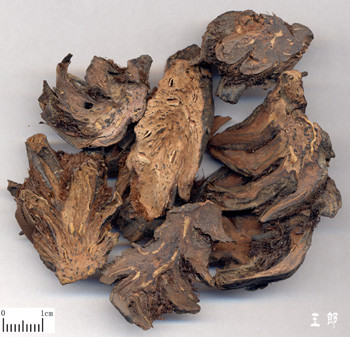 [药材性状] 呈倒圆锥形而稍弯曲,上端钝圆或截形,下端较尖,长10~20cm,直径5~8cm。外表黄棕色至黑棕色,密被排列整齐的叶柄残基及鳞片,并有弯曲的须根。叶柄残基呈扁圆柱形,质硬。剥去叶柄残基或根茎的横断面呈棕色或深绿色,有黄白色小点(分体中柱)5~13个,排列成环。气特殊,味初微涩,渐苦而辛。